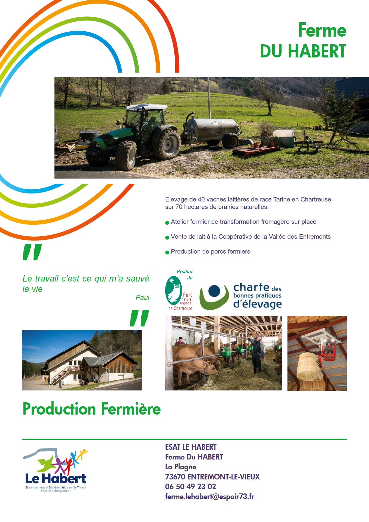 La Ferme du Habert est une exploitation agricole typique de la vallée des Entremonts, avec une quarantaine de vaches laitières qui pâturent plus 60 hectares d’herbage en zone de montagne. Le lait produit est soit transformé sur place, soit livré à la Coopérative Laitière des Entremonts. Quelques cochons sont également élevés pour consommer le petit-lait de la Fromagerie. Les activités principales sont la traite, l’alimentation et les soins aux animaux, les vêlages, la réalisation de clôtures et parcs mobiles, les travaux agricoles…